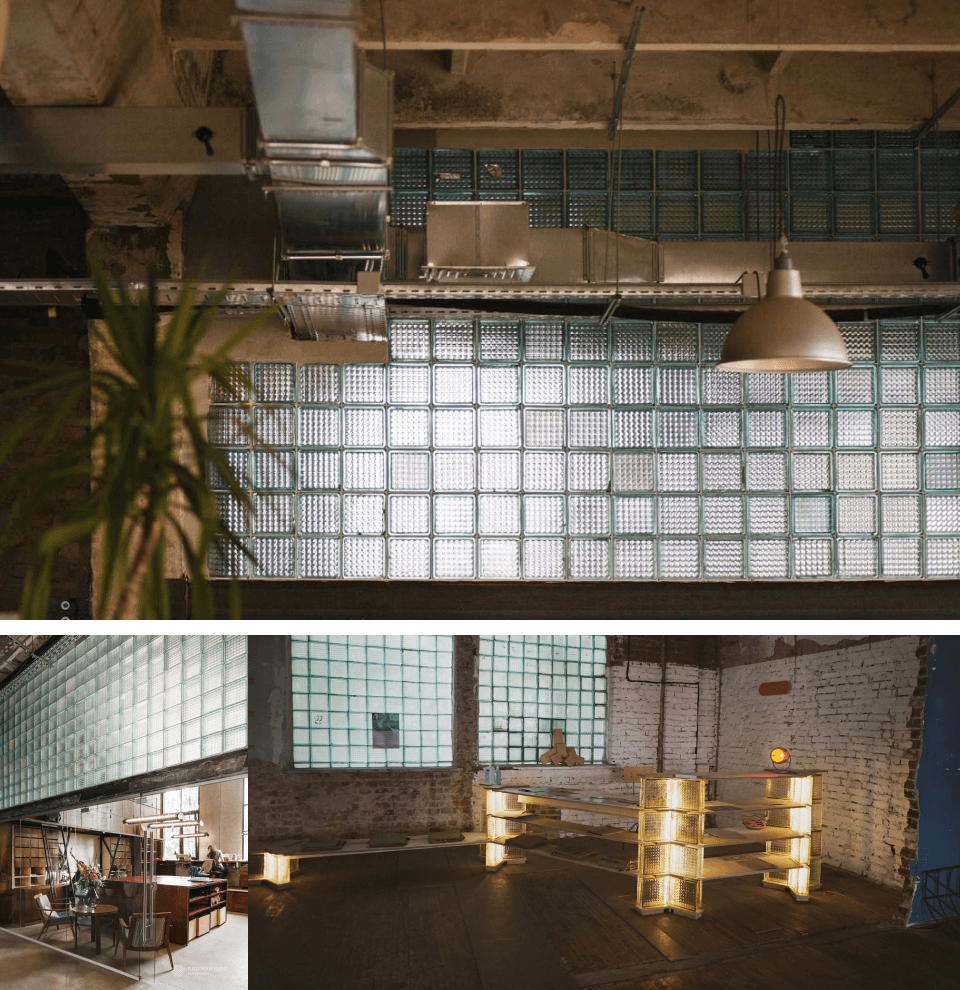 Більшість склоблоків у сучасних інтер’єрах Промприладу демонтовані зі старих корпусів заводу. Цей декоративний матеріал можна побачити на пілотному поверсі та в інтер’єрі Фудмаркету. Ще 20 тис. склоблоків планують використовувати в оздобленні готелю та інших ревіталізованих просторах інноваційного центру.