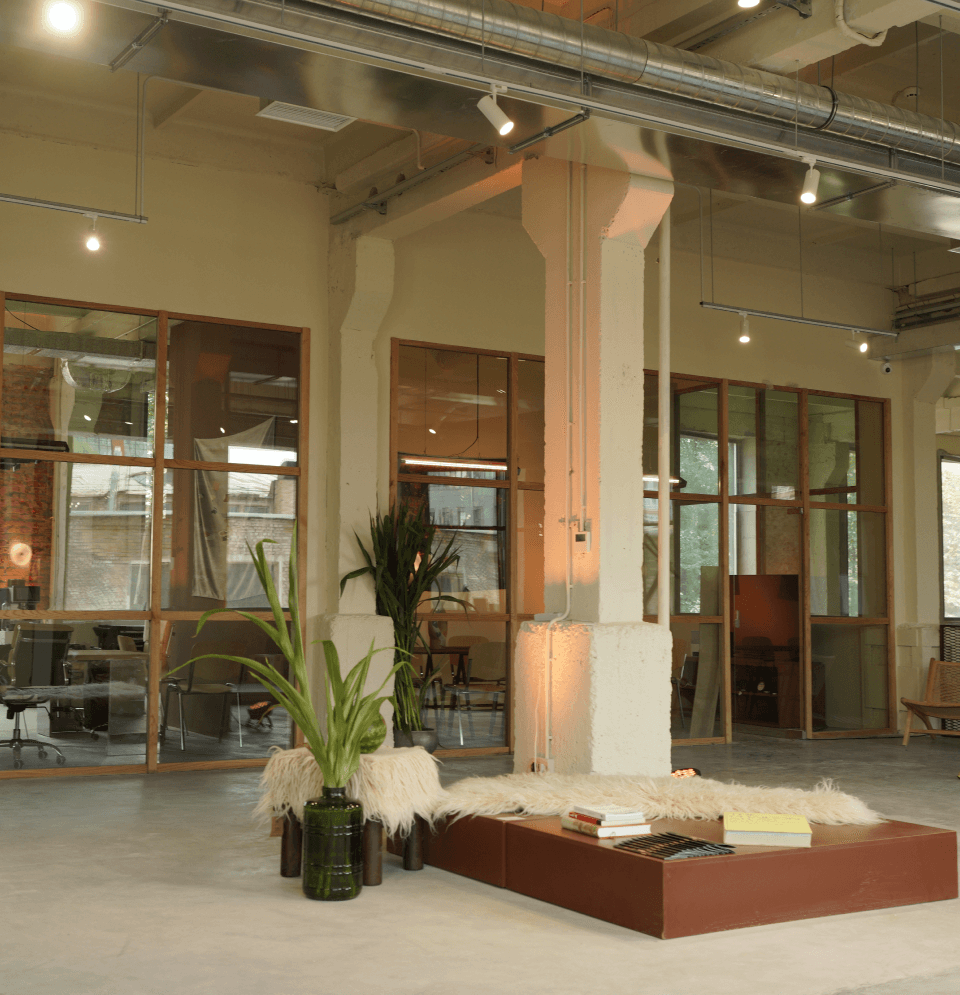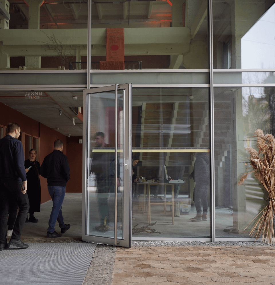 Перегородки створені для зонування простору в Центрі розробок та продуктового дизайну ПОЛЕ. Каркас — деревина (дуб). Внутрішня частина — перевикористані фасадні склопакети. Після завершення терміну експлуатації склопакетів на фасадах готелю їх демонтували та використали для створення внутрішніх перегородок. Такі склопакети можуть довго експлуатуватись всередині приміщень, виконуючи функцію шумо- та теплоізоляції і зонування просторів усередині.