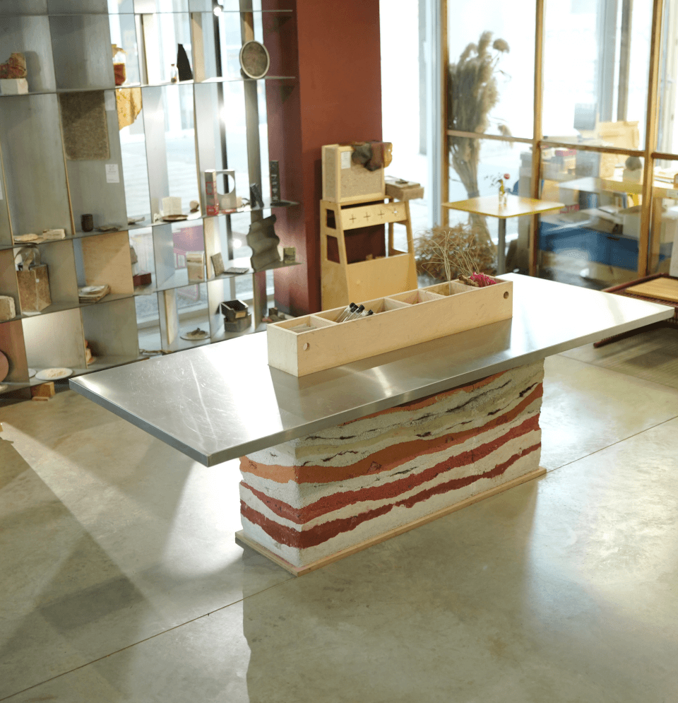 Основа столу зроблена за технологією римського бетону, суміш подрібнених та перероблених будівельних матеріалів утрамбували в опалубку. У цьому типі «бетону» замість портландцементу використали пуцолан (вулканічний камінь) з місцевих родовищ або його замінники. Також до складу матеріалу входить негашене вапно і вода. До основного матеріалу в процесі виготовлення додали перевикористані будівельні відходи різної фракції (бита цегла, камінь), пісок, в деякі шари — вугілля тощо. Римський бетон витриваліший за звичайні будматеріали, він міцніє з часом. Утворені в римському бетоні тріщини самозатягуються завдяки взаємодії вапна з вологою.