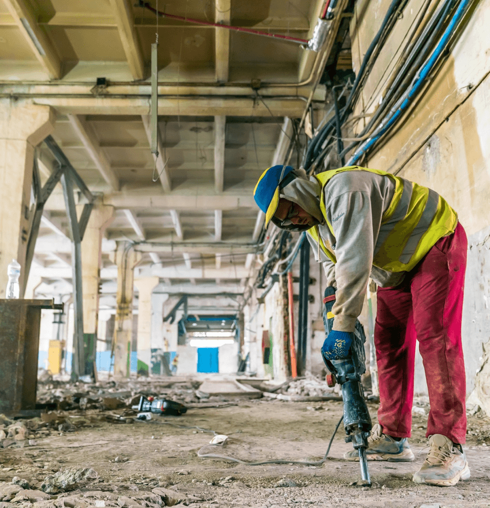 При демонтажі монолітного бетону є можливість спеціальною технікою подрібнити його до фракції щебеню. Так на Промприладі демонтовані бетонні стяжки було подрібнено і перевикористано для створення нижнього шару силової підлоги.